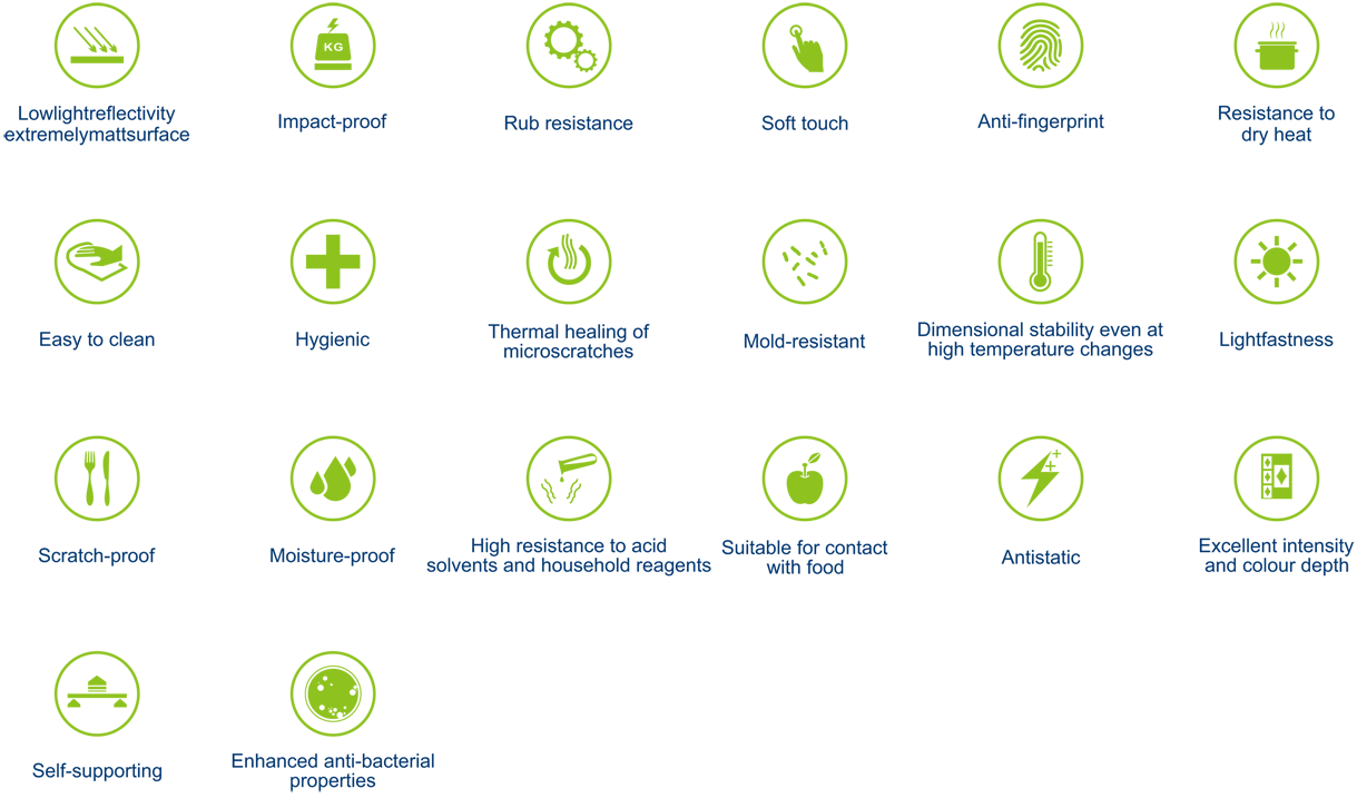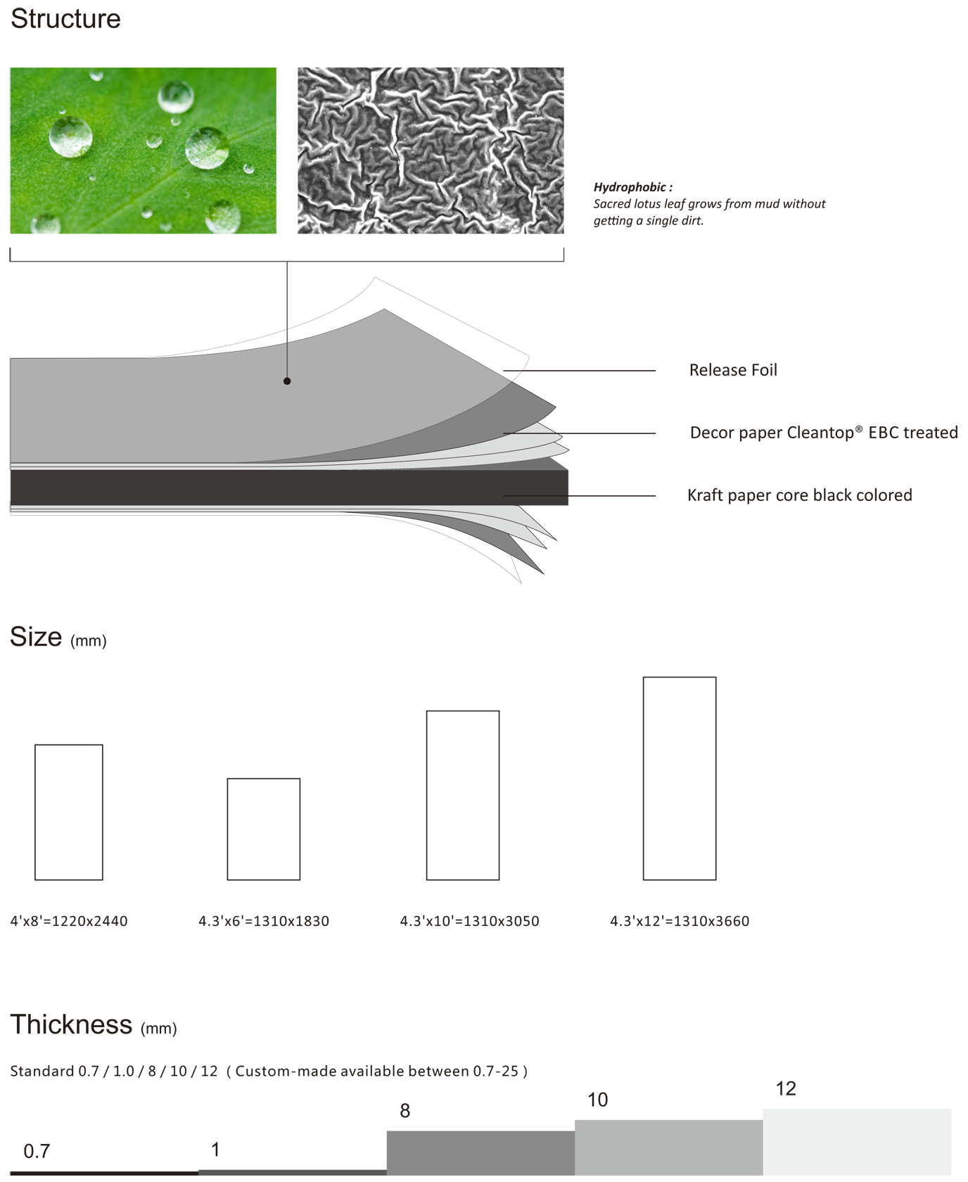 Thanks to the use of the Latest technology---Electron Bean Curing, the surface of ELEX Cleantop® is strongly resistant to scratches, abrasion and microbes. Moreover, It thermally heals any superficial micro-scratches. It is particularly suitable for Hospitality and Hygiene sectors that exploited as kitchen counter top, dining table, bathroom cabinet and hospital furniture etc that is made accordance with EN 438 properties. |